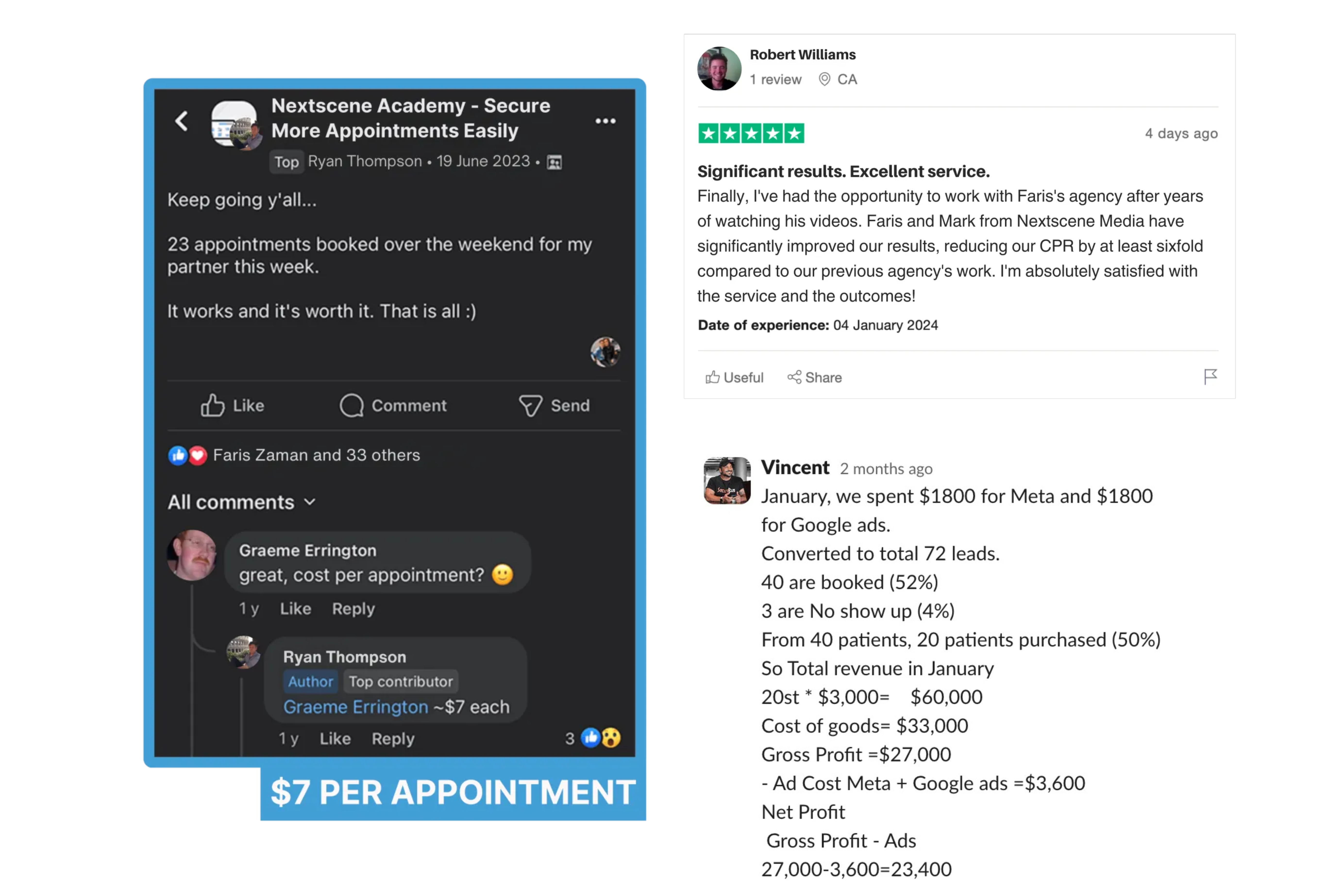 Nextscene Academy really is special. We wanted to make it so good that you'd feel stupid by not ordering it if having a predictable way to get hundreds of high-quality appointments every single month is of any interest to you.