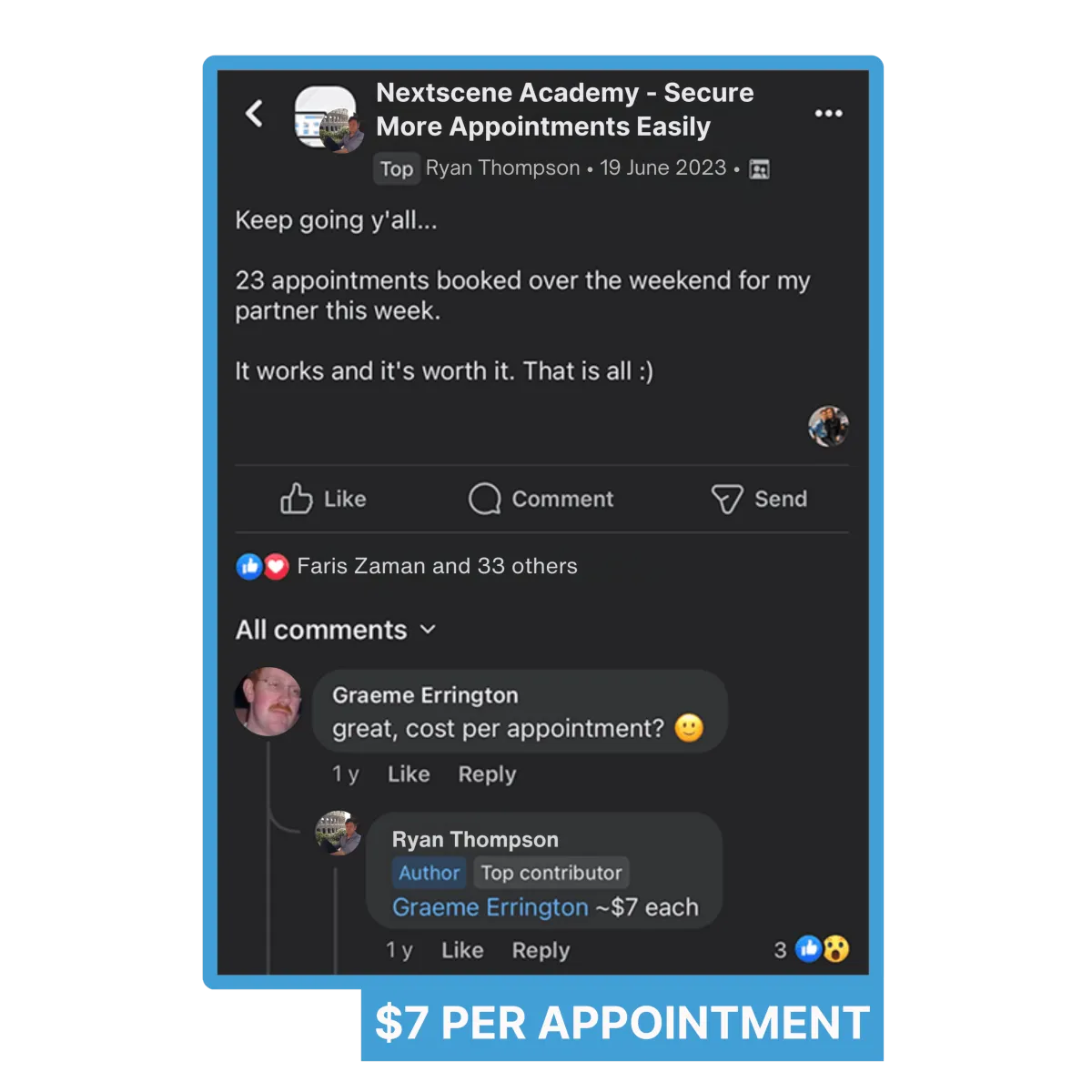 Generally all the other stuff out there teaches people how to get "Leads". Nextscene Academy is different because we don't want you to get "Leads". We want you to get actual appointments and inside this 20 hour course we give you the exact blueprint for you to achieve that.